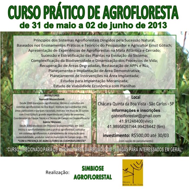 Curso de manejo agroflorestal com Ernst Götsch de 01 a 04/11/2012 Curso básico agroflorestal com Ernst Götsch de 15 a 18/11/2012 Mais informações: www.fazendasaoluiz.com/agrofloresta/cursos-agrofloresta
